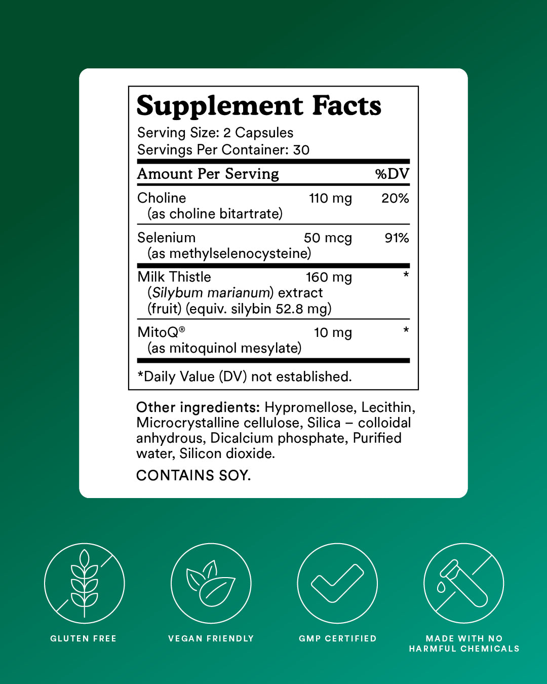 MitoQ +liver is a ground-breaking formula that combines liver-supporting nutrients—Siliphos® Milk Thistle, Selenium, and VitaCholine® plus MitoQ® Mitoquinol, the world’s first mitochondria-targeted antioxidant. Together, these ingredients support optimal liver function and your body’s natural detox processes.